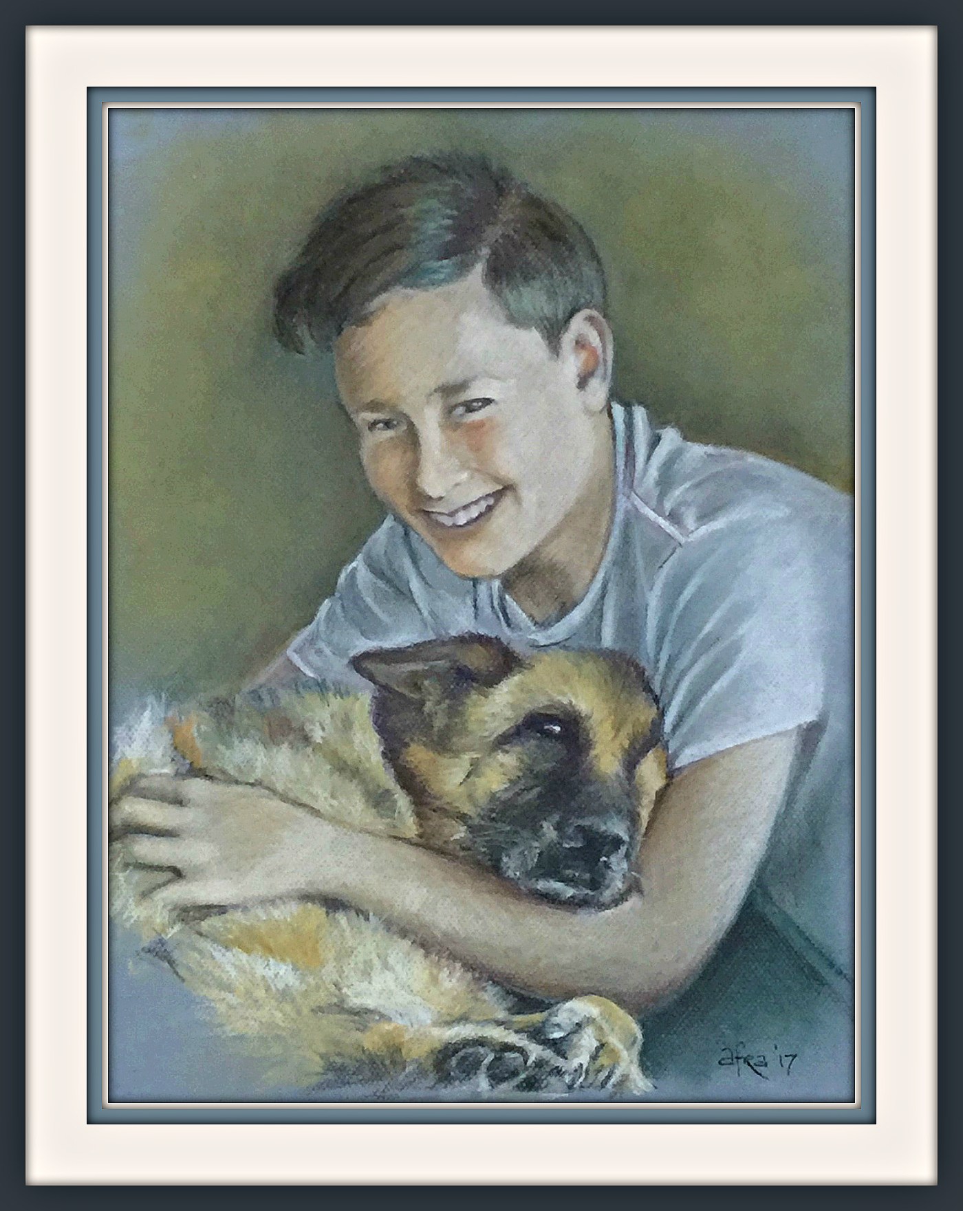 We all felt terribly ripped off as she was such a joy and I offered to paint a portrait of her for the owner. She sent me two photos by email. One of the regal Cody resting on the lawn and the other of her eldest son Jay (Cody’s best friend) embracing her.