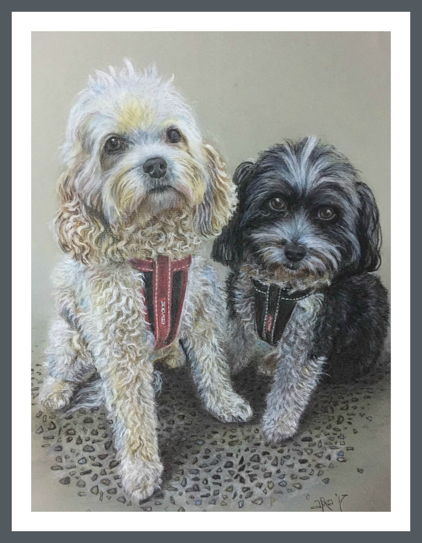 Jack and Harry belong to Liz – a wonderful energetic lady who has recently moved into the area. Liz is often seen walking these two for kilometers upon kilometers and then enjoying a cup of coffee and a snack at the local Flame Tree Cafe while the dogs lap up refreshing water from a bowl provided for them. Because they are so cute and such a part of the fabric of our community now as everyone seems to know them and their owner – this painting was a no-brainer.