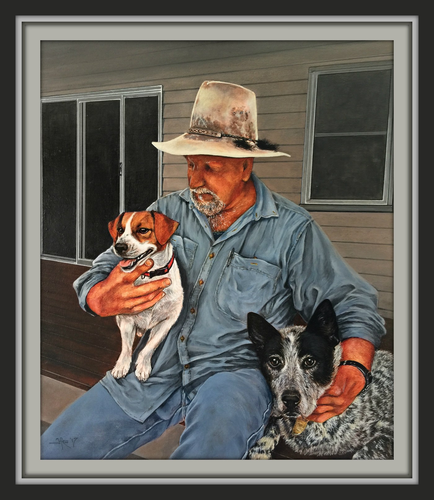 Alan’s two furry friends certainly make cuddle time even better and this painting captures him in a thoughtful moment sitting on his veranda at the top of the steps while the dogs clearly enjoy spending time with their master.
