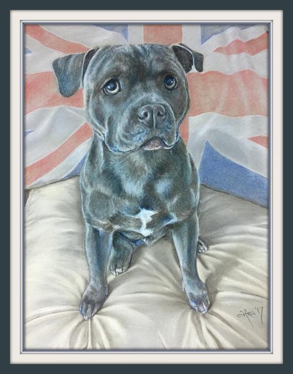 Staffy’s are one of the most popular dog breeds in Australia comprising two versions – the English Staffy and the American Staffy and Quinn is an English Staffy – shorter legged, more chunky and compact and one of the ‘smiling’ dog breeds, although Quinn is portrayed as the more serious regal dog he so deserves to be.   I thought I’d add in the flag just so no confusion reigned over his country of origin.   I will be painting an American Staffy commission soon and once posted it will be easy to see the differences.